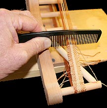 It worked! The comb beat the weft into the warp much straighter than using the shuttle and greatly reduced the amount the weft pulled in the sides of the warp.