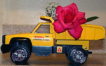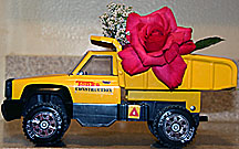 To do so I took a picture of a toy truck with a few flowers in it to provide a mix of hard and soft lines for evaluation. Then I reduced it to 4.6 inches wide at 72 ppi and saved it at three different quality levels: 1 (very low), 6 (medium and the usually default) and 12 (highest quality.) The picture was 201 KB before compression. here's what it looks like at each of the different compression values: