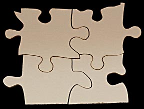 Many high-end profession jigsaw puzzle makers eschew puzzles cut to a repeating pattern because it's considered less artistic. Free-form cutting creates a more challenging puzzle that demonstrates the cutter's virtuosity with a scroll saw. Since my goal is to produce jigsaw puzzles that are easy for the user to assemble, I prefer to cut to a pattern. The human mind has a great facility to group similar objects to speed sorting. Jigsaw puzzles made with all the same shaped pieces like this: