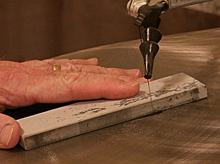 I put a Flying Dutchman 3/0 blade in my saw, turned it on and using a 1/4-inch thick fine Arkansas knife sharpening stone, ran it over both sides of the blade until the blade was ground down to 0.0055 inches thick.