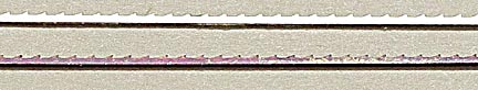 Second only slightly in importance to the saw is the blade put in it. For cutting jigsaw puzzles the standard workhorse is the 3/0 size blade. Measuring approximately 0.023-inches wide and 0.009-inches thick it cuts an average kerf (cut width) of 0.010 inches. It's wider than the blade because the blade's teeth lean out to one side (like a burr) making it cut a wider swath than the width of the metal used to make the blade. Actual blade dimensions vary with brand. I measured Olsen 3/0 blades at 0.009 inches thick, 0.0095 inches including the burr. Flying Dutchman blades measured 0.008 inches thick, 0.0082 inches including the burr. (A note about Flying Dutchman "Special Puzzle" blades advertised as being only 0.015 inch wide instead of the standard 0.023 inches for 3/0 blades. When mine arrived I measured them and they read 0.023 inches, not 0.015. I contacted Mike at Mike's WorkShop where I bought them and he said he was just passing on the specifications given to him by his supplier in Germany.) Jeweler's blades go down to 8/0, which are 0.0063 inches thick. They have extremely fine teeth that clog easily with sawdust and cut very slowly. They are also delicate, typically lasting only long enough to cut 10 puzzle pieces.