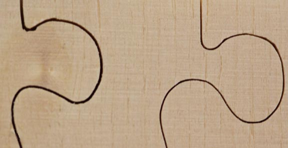 Why all this talk about blades widths, burr widths and kerfs? Because the wider the kerf, the cruder the final jigsaw puzzle will look. The smaller the kerf, the smaller the gaps between the puzzle pieces will be, the tighter they will fit together, and the harder it'll be for the person putting the puzzle together to see them. Small kerfs are the holy grail of hand cut wood puzzles. If you want to make heirloom quality jigsaw puzzles you have to do everything you can to minimize kerf... well, almost.