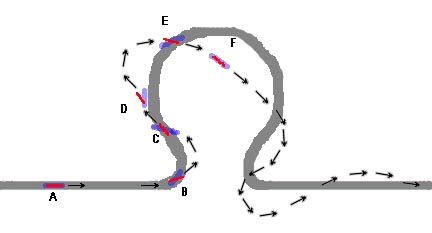 In this drawing light blue represents the direction you aim the blade. This is also the direction the top of the blade points. The thin red line is the direction in which the part of the blade that's cutting wood is actually pointing. Anytime they don't line up there is torsion in the blade. At A everything's going great. At B you start turning the work to cut up the side of the key. The blade doesn't want to turn so it tries to go straight. It ends up cutting half way between where you want to go and it wants to go. Just as you muscle it back into line at C, the torsion stored by the blade's twisting causes the blade to suddenly snap around at point D, cutting a swath through the wood that's wider than wanted. You force the blade around trying to get back in line with the top of the key at E, the blade twists again and cuts the top off the key. Around F you give up and follow the blade where it wants to go. The twist eases out and things start to look better. Then you begin turning to create the bottom of the key and the twisting/correcting process repeats itself forcing you wander all over the board.