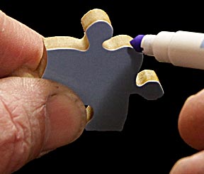 Another option would be to use half as many layers of tape on each strip and put them in the same place so that they add to provide the correct kerf. Line them up together and use them to test pens to find which create the best blending effect. You'll usually want to go lighter than the color on the puzzle's face. That's because as it's applied to the edge it's absorbed into the paper's edge and ends up looking darker. Once you've selected the pens that work best, take up each piece and carefully color the top 1/16 inch of the piece with the appropriate color. Some pieces may only need one pen, other several. This process takes time but is well worth it.