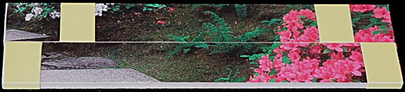 Each azalea bush has a slightly different color, making sorting pieces easy. The bushes are discrete rather than part of a solid field. This creates many more borders that helps identify where pieces go. (In the original, all the azalea bushes were the same shade of pink, which would have made figuring out which pieces go where an exercise in frustration. One at a time, each bush was selected and its color changed to make the puzzle easier to assemble. Even the white azaleas were pink in the original.)