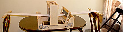One advantage to this technique is that because there are no bundles of thread to deal with it's extremely easy to keep track of individual warps. Additionally, using a dining room table and chairs puts everything at a comfortable height and eliminates the need for a warping board.