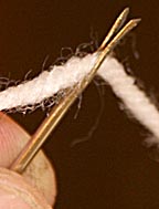 I start a warp thread by slipping the loose end of yarn from the skein into the end of the needle.