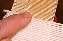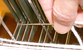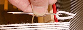 The key that saves a lot of yarn manipulation is a needle modified to quickly and easily grab the yarn so it can be fed through the reed and heddle.