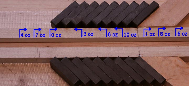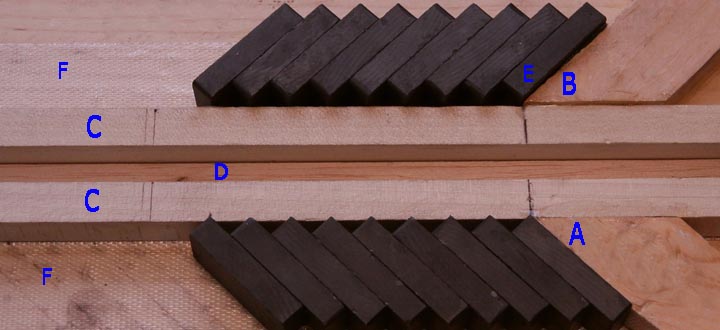 These magnets are mounted on any flat surface, usually a piece of wood eight inches wide and four feet long, in a "V" configuration 45-degrees from the perpendicular. In the example above, the angle is set by two pieces of 1 x 2-inch wood (pieces A and B) cut at 45 degrees. The magnets don't like being angled so they need to be firmly secured. A layer of 2-inch wide masking tape across their tops helps lock them in place. It isn't shown in the above image so the orientation of the magnets can be seen more clearly. The angle blocks are glued to the base board as well as two 3/4 x 3/4 inch strips of wood (C) 18 inches long. The strips are 9/16 inch apart (D) and serve as the bore of the permanent magnet gun. Be careful when gluing them to the base so that no glue is pushed into the bore. If this happens, it can prevent the projectile from sliding freely. Double faced indoor/outdoor carpet tape (F) on the base and the faces of the angle blocks (A and B) hold the magnets in place. A strip of 1/2 x 3/16 balsa wood is laid down on the bottom of the bore using double faced tape. This lifts the projectile so that it moves just below the center of the magnetic fields rather than the bottom where it curves and is weaker. A thicker strip that places the projectile at the very center of the angled magnets may result in the projectile flipping out of the bore. The reason is that field curvature in the angled magnets cause the end of the projectile to become slightly lifted. When the projectile is accelerated, this angle causes the lower front edge to drag on the bottom of the bore, creating a backward force below the center of gravity. Since the projectile is already at an angle the opposing accelerating and drag forces create enough torque on the projectile to cause it to flip over.