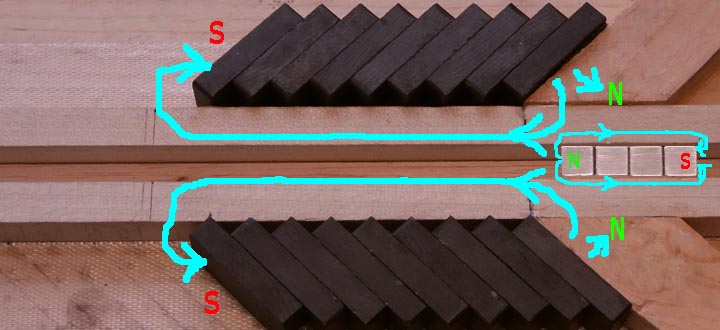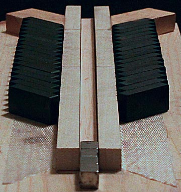 The large black ceramic magnets are placed so that both angle stacks have the same poles facing the breach. In the image below the north pole in both stacks is pointing to the right