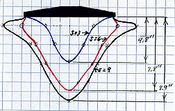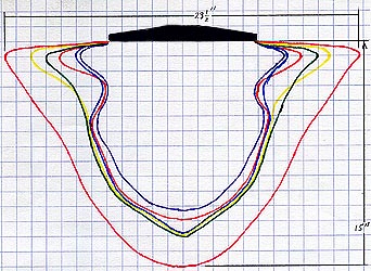 This graph shows the effect on the size and shape of the detection envelope as sensitivity is changed from 3.0 to 6.0 to 9.0. The detector was in all-metal mode and equipped with a 9.5-inch imaging coil. The targets were clad quarters.