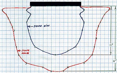 Values for 20 passes over a clad dime buried at 3 inches ranged from 5.5 to 9.5 with an average of 7.8. A silver dime ranged from 7.5 to 10.5 with an average of 9.0. The system seems to work for small coins, but is shifted down 1.0 points.