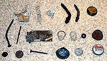I spent several hours beach combing with the Garret on January 18, 2003 with the metal detecting club I joined. The pickings were slim because the area had been previously swept by residents. However, I focused on the parking islands and an area surrounding a telephone and while I found nothing of value, I got a lot of valuable experience in the field. Here's my meager take:
