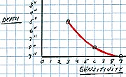 This gives me a way to double check a Target Imaging readout that's trying to tell me that I'm looking at a large deep object. Let's say that at sensitivity eight I saw a brief flash indicating the target was a coin five inches deep, but for the rest of the time it says the target is a can at 12 inches. If I cut the sensitivity to five and the target is still detectable, it's more likely that it's small and shallow. This is similar to raising the coil several inches and if the target fades, it's likewise probably small and shallow. I suppose this chart could be used to pinpoint an object's depth. The problem is that the chart changes with soil conditions.
