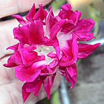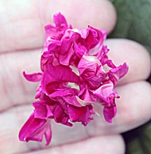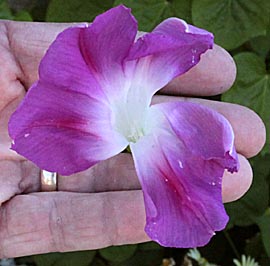 Available only as a mix of blue, magenta and purple with distinctive white stars and a solid pink, Mt. Fuji morning glories produce beautiful four to five inch diameter flowers. Unfortunately, there is a high price to pay for this beauty. The plant is a terrible climber. I had go out every day to twist the vines around the trellis. They simply wouldn't climb on their own, preferring to sprawl over the ground. Combine their poor climbing ability with extremely rapid growth and you have a real challenge to control this variety. On the other hand the flowers can be beautiful and last all day on the plant, many opening late in the afternoon. Countering this is the fact that only one quarter of the flowers open as shown in the photos above. The petals of Mt. Fuji morning glories are extremely thin and fragile, particularly the magentas. Very few open cleanly. Most, particularly the magenta ones, end up looking shredded, like the following: