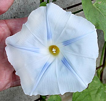 Bright Eyed Girl is an excellent self-climber and covered the trellis with a solid mat of attractive, heart-shaped leaves. It produces a large number of flowers that open even if the temperatures are in the 50s, providing a beautiful view to welcome the day. Unfortunately the flowers fade as soon as air temperatures hit 90 degrees, around 10 AM in my location during summer. (Air temperature seems more important that sun light intensity in determining when morning most glory flowers start to fade.) On days where the temperature remains in the 70s, the flowers may stay open all day. I recommend Bright Eyed Girl to anyone wanting a solid wall of green with beautiful morning flowers.