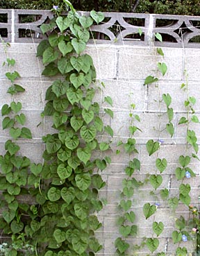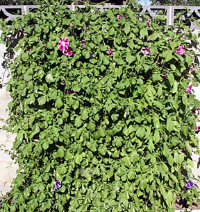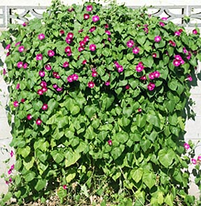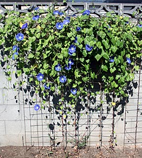 Before rushing to the nearest garden center to load up on packets of morning glory seeds, I browsed cyberspace to find the best varieties. I was disappointed to discover that in spite of their universal popularity there is remarkably little detailed information available on morning glories. There are dozens of sites that provide generic descriptions of flower color and size and how high some species can climb but I couldn't find any that describe how well a particular species preforms as a wall cover, how long the flowers remain open, how good a climber it is or how well the flowers cover the plant. Hence this page.
