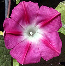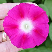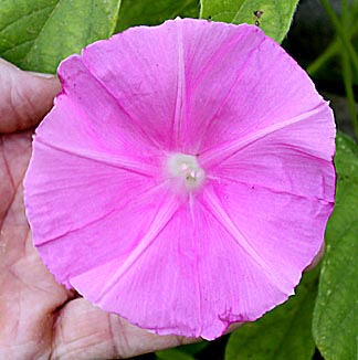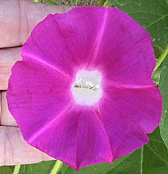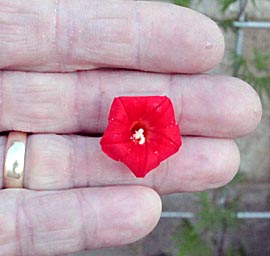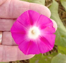 I found Crimson Rambler virtually identical to Bright Eyed Girl. Although the flower in the photo above is slightly smaller than those of the Bright Eyed Girl shown earlier, that's because it was taken after the weather cooled and as with many morning glories, flower size had deceased. The plant appears similar as well, though it didn't had the chance to mature to the same size.