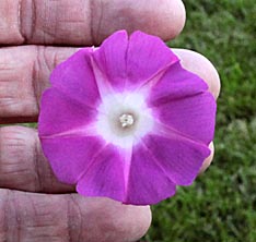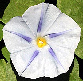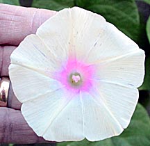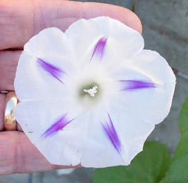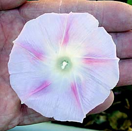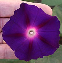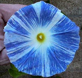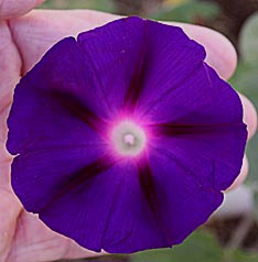 By far the most interesting thing I've been following during the morning glory comparisons for this page is their flowering patterns. While their name suggests they flower mainly in the morning, I've discovered that when they flower is most strongly determined by air temperature, enabling many varieties to remain open all day long in cool weather. Some varieties can open when the temperatures are in the fifties while others wait until the air warms up into the 60s. Some close as soon as they hit 80 degrees while plants right next to them stay open above 90. Strangest of all, when cool Fall temperatures arrived in my backyard several varieties seemed to reset their flowering temperatures. Plants that were reluctant to open flowers below 60 degrees were suddenly greeting me first thing in the morning with beautiful displays even when the air temperature was a brisk 45 degrees. Another effect of cooler weather is that flower size is half of what it was during summer.