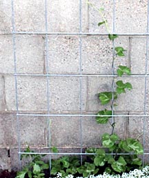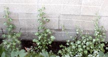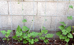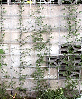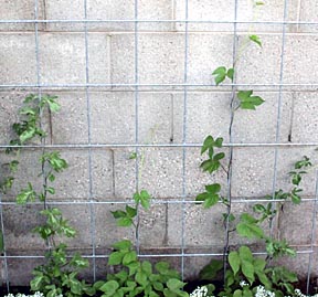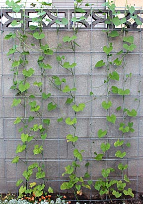 For the comparisons on this page, I'm growing five plants for every 5-foot wide trellis to compare how well each variety hides the block wall behind it.