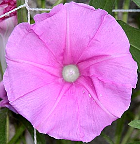 All of the morning glories featured on this page are grown in my high desert location in southern California with summer highs typically around 100-degrees, humidity 12-percent and night time lows of 66-degrees. Although heavily amended with shredded leaves and peat moss every year, my arid soil remains slightly alkaline, around 7.2. Bed depth is a good 18-inches and fitted with a drip system. The morning glories are planted 6-inches from the base of the concrete block wall so their roots come in contact with the wall's cement footing, consequently their soil will be slightly more alkaline. The plants trail up concrete reinforcing cloth (1/8-inch diameter wires welded into a mesh with 6x6-inch squares) that is 6-feet tall. Although many varieties of Morning Glories can reach 20 feet tall, mine are all trained to be only 6-feet high.