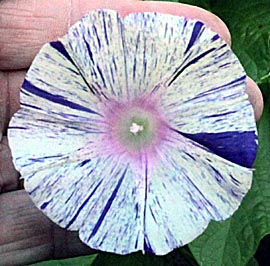 Well formed 3.5-inch flowers began blooming 12 weeks after planting. Attractive up close, the striped flowers fade to a bland gray-blue when viewed from more than 20 feet. As the plant matured it began producing perfectly formed trumpet shaped blossoms 4-inches across.