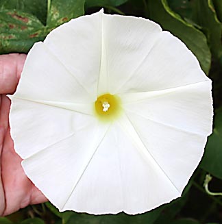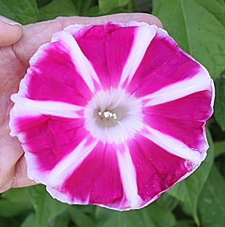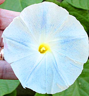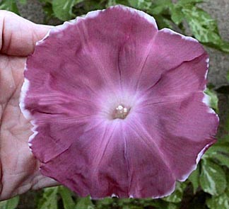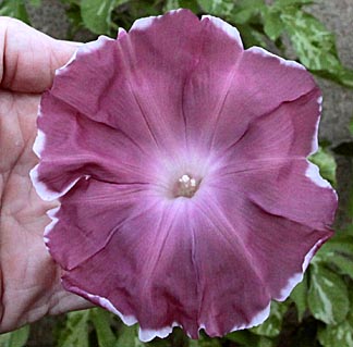 Retested in 2010, this plant put on an impressive show by producing large qualtities of large, beautiful flowers. But, late in the season the leaves of both it and its look-alike Milky Way (please see below) had taken on an unhealthy yellow color that suggested a virus had infected them. None of the surrounding morning glories shouwed any sign of the problem. Also, these plants seemed to attract aphids while none of the other morning glories were bothered by them.