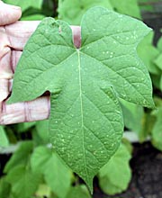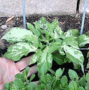 Plants with pink flowers don't have these markings. Many seed companies push the variegated foliage as a bonus. In fact, the mottling is difficult to notice from anything over ten feet away and almost completely vanished from my plants by the time they were three months old. I don't know if this was the result of age or high summer temperatures. A big problem with the foliage is that the vines are thick and very tough, making their removal from the trellis extremely tedious at the end of the season.