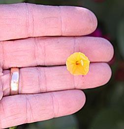 Three weeks of growth got this variety to 6-feet tall. It's a good climber but the plant is very spindly. Only one of the 10 seeds planted germinated. Neighboring morning glories quickly over grew it and by 12 weeks I'd assumed it had died. Then after 22 weeks I spotted tiny flowers that looked like a weed, but when traced back to their source turned out to be the long lost yellow morning glory vine. The small, uninteresting flowers and weak growth do not recommend this variety as a wall covering.