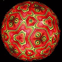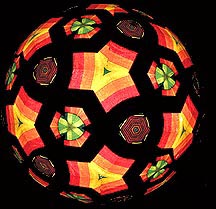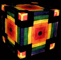 The idea is to use a quilt made out of many different pieces of cloth, each with a bright and interesting pattern, as the object to be viewed through the kaleidoscope. Each segment is connected to its neighbors with 1/2-inch wide strips of black ribbon. This black edging turned out to be the most important part of the quilt because it creates interesting geometric patterns. Light shining through the cloth illuminates it making the image in the kaleidoscope appear to glow. The cloth is draped over a dome that houses the lighting system. The quilt can be slid and rotated over it to create an almost infinite array of unique images.