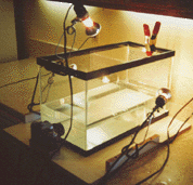 (3) Reflections: Shine a light on a glass surface in front of a camera and the odds are there'll be a reflection right where you don't want it. Placing the camera lens right up against the glass of a water-filled tank whose depth is the same as the close focus for the camera and having the lights come in from the sides eliminates this problem. For my trusty old Pentax MX 35mm camera with a 50mm lens, a standard 10-gallon tank is perfect.