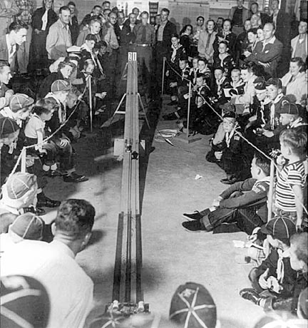 The race was the idea of Cubmaster Don Murphy as a substitute for Cub Scouts too young for the then immensely popular soap box derby. Thanks to an aggressive advertising program by the Scouts and their sponsor, North American Aviation, the race was a huge success. The track was a two-laner, made of wood and 31 feet long, which is very short compared to today's standard 42 feet.