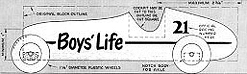 Early pinewood derby kits consisted of a partially precut block of wood suggesting a profile similar to 1940s Indianapolis 500 race cars, plastic wheels, axles and two smaller pieces of wood for mounting the axles on the car body.