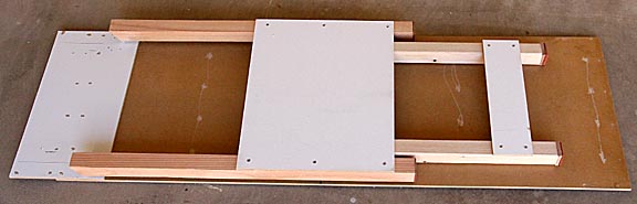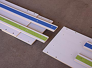 The basic construction is the same as for the 2-lane track. One difference is that the overhanging sections of the guide rails used to connect the bed sections are only 2-inches long and only use one screw each.