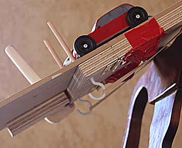 If you want a more professional start system, simply attach a piece of wood on a hinge to the underside of the base board under the start point and spring load it with two rubber bands so that they pull it down and back. Cut two long channels in the middle of the track in front of where the cars stage before the race and attach two dowels to the hinged board so that they stick up through the track when the hinged board is held flat against the track. Attach a handle with a release to one side to hold the hinged board in place until it's time to start the race. The following two pictures give you the idea: