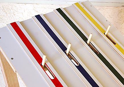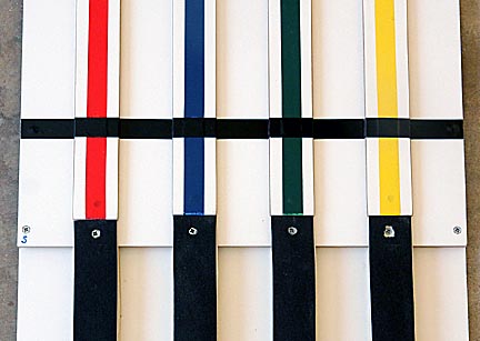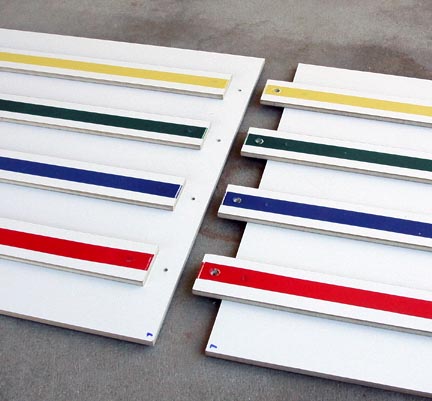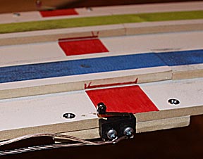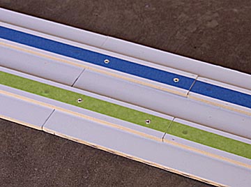 The colored lines down each guide rail aren't only for decoration, though they do a great job of brightening up the track. They help the people watching the race identify which track their car is on. They also help the people running the race keep track of which lanes cars have run on so they can follow the proper rotation. I used vinyl tape on this track and discovered it was a poor choice. It's almost impossible to apply without stretching it. As it rests on the track the adhesive is soft enough to let it slowly pull in on itself, causing the tape to shrink. This results in gaps at each break in the track. These can be colored in with felt pens but the gaps are still visible. If I had to do it over I'd take the time to find colored masking or non-stretching acetate tape.
