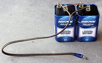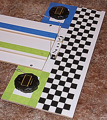 Although the timer was set up to be powered by wall power, I prefer to use a battery pack so there isn't an electric cord on which children can trip. Two 6-volt batteries connected in series provide the needed 12 volts for over 4 hours of racing.