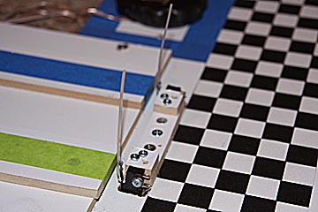 Like the 2-lane track, the starting gate is simply a strip of 3/4-inch plywood with four, 3/8-inch diameter wood dowels mounted in it.