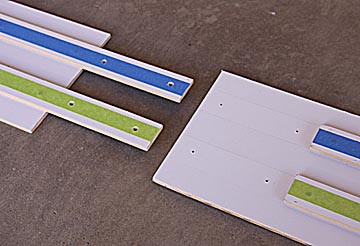 Use a saber saw and a very straight cutting guide to cut the board into four pieces that are 8-inches wide by 8 feet long and eight pieces that are 1 3/4-inches wide by eight feet long. If you don't have an eight foot straight edge, cut one of the 8-inch wide boards as straight as you can and use its good edge, the one cut by the manufacturer, as a guide for the rest of the boards. The 8-inch wide pieces will have their edges on the outside and don't interact with the cars so they aren't important. But, the narrow strips are going to be the guide rails and have to be perfectly straight and smooth. I used a fine metal cutting blade in my saw, a high blade speed and a slow cutting pace and came out with edges that were so smooth they hardly needed sanding. The four, 8-inch wide pieces will form the bed of the track. Cut eight, 1 and 5/8-inch wide guide strips from the remaining 16-inches remaining of the board.
