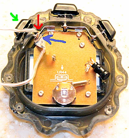 Take the back off the stop watches. The timer's on/off button (green arrow) works by pushing on a piece of flexible metal (red arrow) to make contact with a fixed piece of metal (blue arrow.) When the two pieces of metal touch they complete a circuit that starts the stop watch. When they touch a second time they stop the watch.