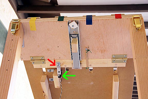 The red duct tape holds two pads in place where the hooks that hold the rubber bands strike the underside of the track when the release is triggered. They quiet the loud bang of the hooks colliding with the track.