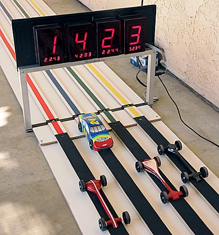 Nothing makes a track more impressive than a good timer. There are several available. For myself, I preferred the doublesided Smartline timer with elapsed time offered by eteckgadgets.com. I believe it's the best buy for what you get. $550 is a lot of money, but in fact is very reasonable. Remember, you're not just getting four timers, but the software to compare the four times and decide which was the fastest. I like to think that by building my own track I saved enough to buy a good timer. This timer is easy to modify to fit any track configuration. Installation only requires four holes to be drilled in the track near the finish line into which the infrared signalling LEDs are mounted and a microswitch to be mounted on the release gate to signal the unit when the race starts. Both are easy and simple tasks.