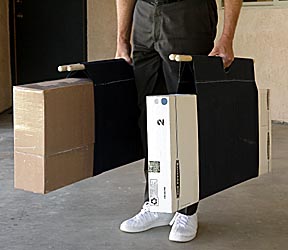 For storage and transporting, I discovered that the the two packages come out weighing the same if one of them holds the flat sections while the other holds the first four sections with the support legs. Although the package with the legs will be thicker, because much of its volume is air, it actually weighs the same other, thinner package. To hold the two packages together and protect the ends of the track sections from getting damaged, buy four, 16-inch cardboard boxes and modify them to fit snuggly over the ends of the packages. For extra padding I doubled the thickness of the cardboards on the ends. For the end caps to fit the order of stacking needs to be the same every time the track is stored. The empty spaces between the legs are convenient places to carry assembly equipment, the foam end stopper and screws. To carry the packages I sewed two slings made out of heavy canvas with 7/8-inch dowels running through the sleeve provide even support along the full length of the slings.