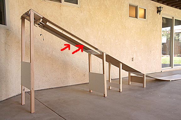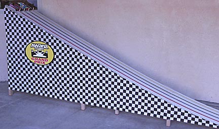 Another difference is that there are hinged legs attached to the bottom of the first three track sections to elevate the start end of the track. These legs force the first eight feet of the track into a flat zone with a 26-degree incline, which is standard configuration for most tracks.