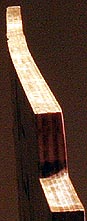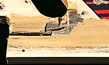 After this break occurred, it appears the playfield had been thrown into a corner and left standing on the broken section of wood. Over time, the weight of the playfield warped the wood so that the lower right corner, as seen on the top view of the entire playfield above, had warped over an inch upward. Any attempt to repair the break without first removing the warp was doomed because of the enormous torque the warp would put on the glue joint.