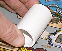 It's common for old playfields to have lenses that have worked their way up above the level of the playfield because of thermal cycling. In the case of this TAF playfield the "Cousin Itt" lens had moved up the thickness of four sheets of paper, enough to disturb ball movements. The classic solution is to use a hot air gun, my wife's hair drier in this case, on the back of the playfield to soften the glue holding the lens in place and push it down level from the other side.