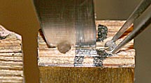 Next I attacked the break. Using tweezers, I pulled out any loose bits of wood, then used an exacto knife to scrape off rotted wood and old wood putty. A thorough cleaning with naptha came next.