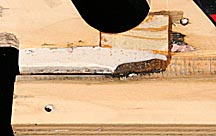 Because of the constant pounding this area gets the top surface of wood was pulverized. I carefully scraped this off since it would weaken any patchwork to follow.