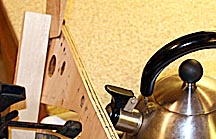 To remove this warp I clamped a block of wood to press the warped section back into place. Then I drove in a wedge to bend the warped playfield in the opposite direction of the warp. I then heated the back of the playfield in the area of the warp with steam from a tea kettle for ten minutes.