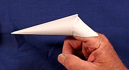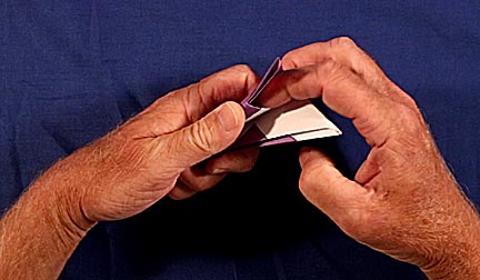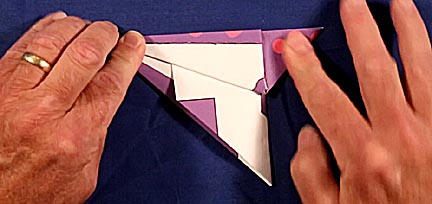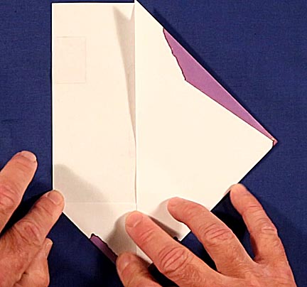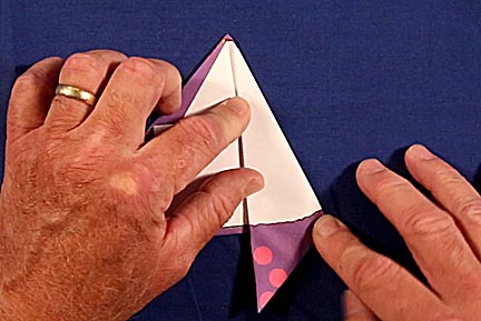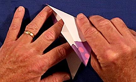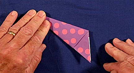 Turn the paper sideways and bring the lower left corner in the previous image, the corner being held down by my left hand, up and place it on top of the forty-five degree angle formed by the first fold.